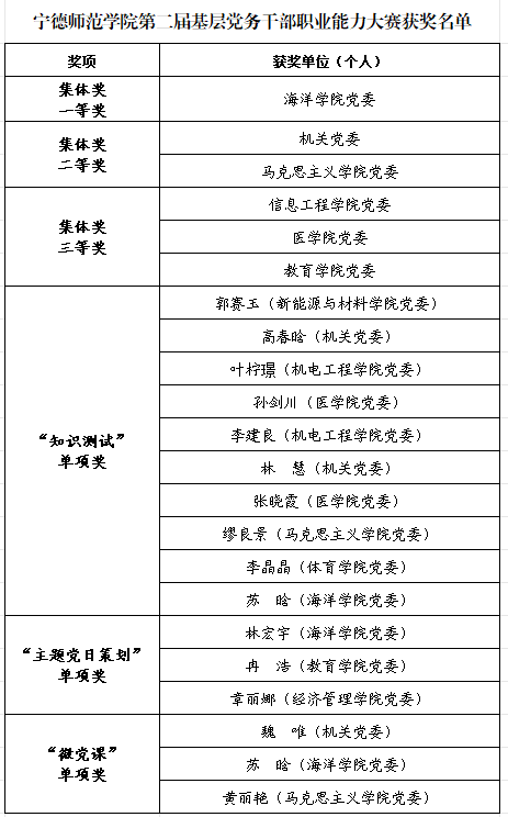 经过紧张激烈的角逐,共评出集体奖一等奖1名、二等奖2名、三等奖3名,同时,还评出“知识测试”单项奖10名、“主题党日策划”单项奖3名、“微党课”单项奖3名。